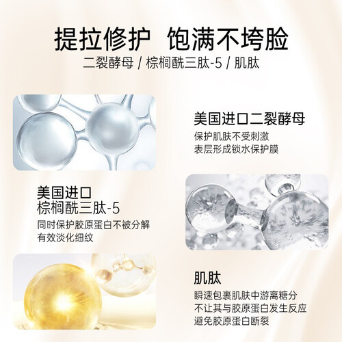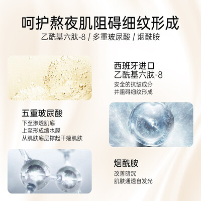 多重玻尿酸成分,阻碍细纹形成,令肌肤紧致光滑。蕴含富勒烯和二裂酵母等成分,可为肌肤补充所需的营养,使用饱满不垮脸。