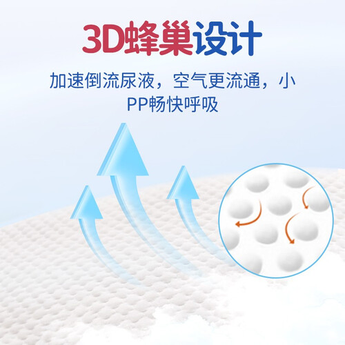 面层加入3D蜂巢设计,可瞬吸并导流尿液,使得尿液分布更均匀,减少鼓包,穿戴更舒适。