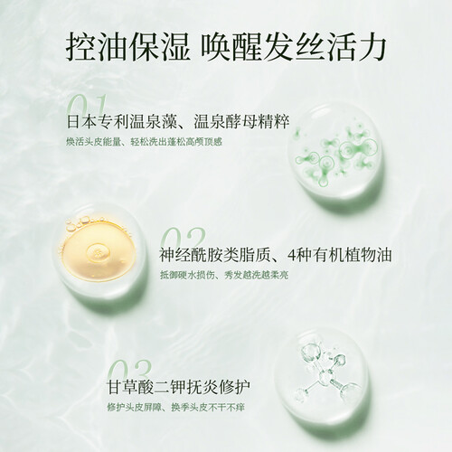 含神经酰胺类脂质成分,有助于软化硬水,温和养护发丝和头皮;选优天然温泉藻和温泉酵母,帮助修护头皮损伤。
