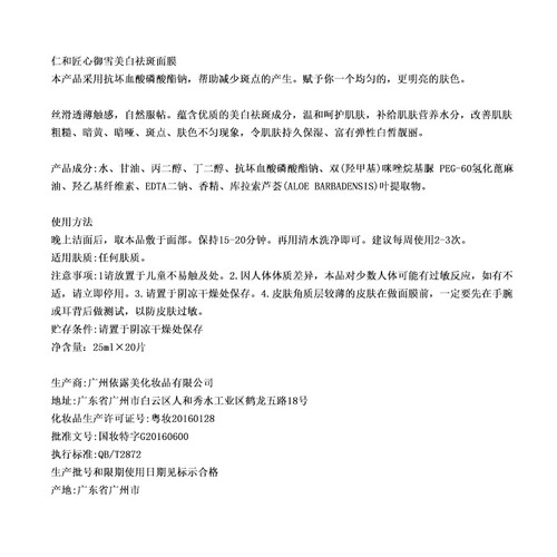 仁和药业 美白补水面膜