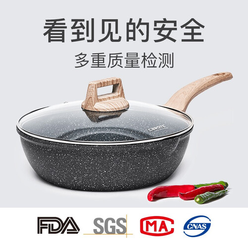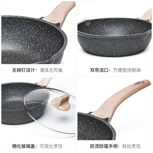 采用麦饭石涂层,不粘的同时可以减少油烟的产生,让你拒绝做黄脸婆。双导流口设计,倒油倒汤方便的同时保证安全不烫伤。