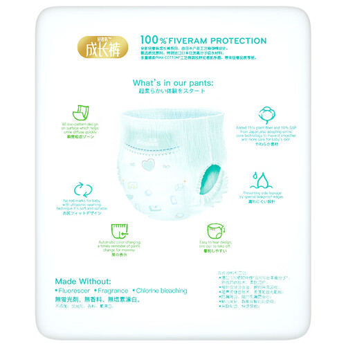 选用了百分之三十的植物纤维来呵护,设计立体的腰围,松紧度都很适合每位宝宝的穿戴,夜里翻动也不会尿床。