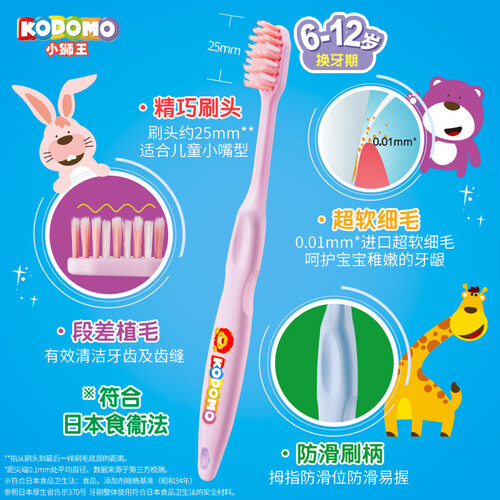 精致小巧的刷头设计,灵活轻便易刷牙,提升宝宝使用的舒适度;搭载双重适齿刷毛,能够深入牙缝清洁,柔软质地,呵护牙釉质。