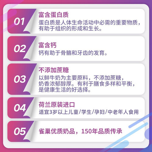 荷兰自然牧场奶源地,让奶质更香醇,入口甘醇爽滑。奶粉中富含天然蛋白质和钙,使中老年人骨骼更坚固。