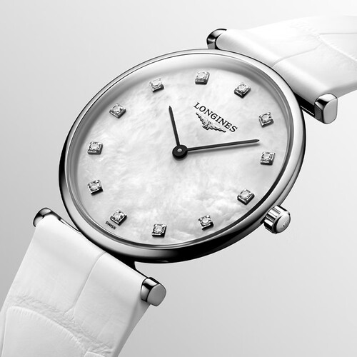 精钢表壳与简约的白色贝母表盘相结合,体现不俗的质感,读时简洁明了。表壳轮廓纤细流畅,增添了隽永美感,点缀腕间风情。