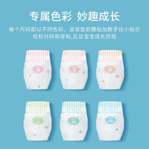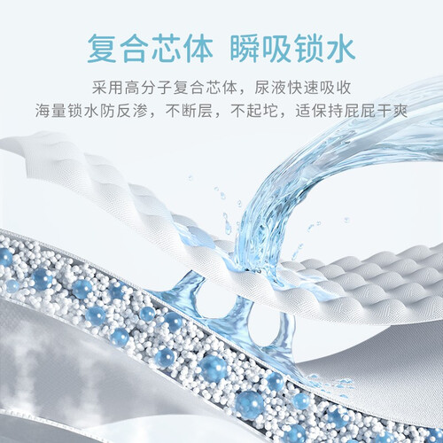 复合芯体,开启瞬吸模式,让屁股更清爽舒适。双重护边,满足宝贝好动的天性,轻松应对不漏尿,宝妈更放心。