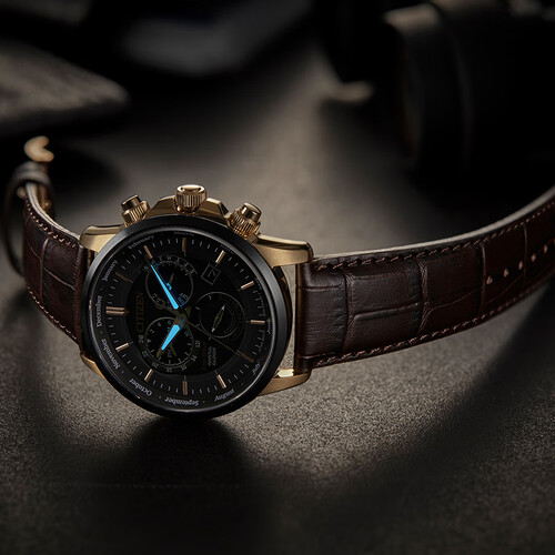 咖色的牛皮表带韧性强,反复翻折也不易产生折痕;光动能的机芯可以避免反复更换电池,使用更长久。