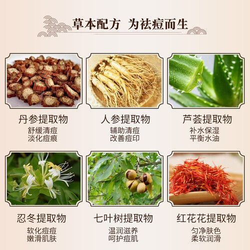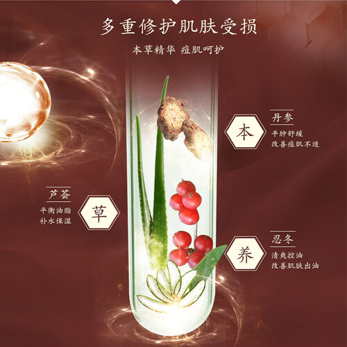萃取丹参,芦荟,忍冬等多种草本精华,给肌肤多重呵护,细腻爽滑。搭配温和配方制作,ph值呈弱酸性,稳定肌肤状态。