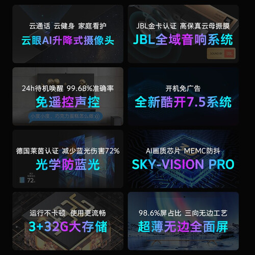搭载光学防蓝关技术,可有效阻挡有害蓝光,减少眼部刺激感。超薄无边全面屏的设计,进一步提高屏占比,摆脱边框束缚感。