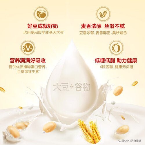 甄选非转基因大豆和谷物原料,豆香谷香协和,交叠有层次,口感浓郁十分好喝。低糖低脂零胆固醇,助力轻饮零负担。