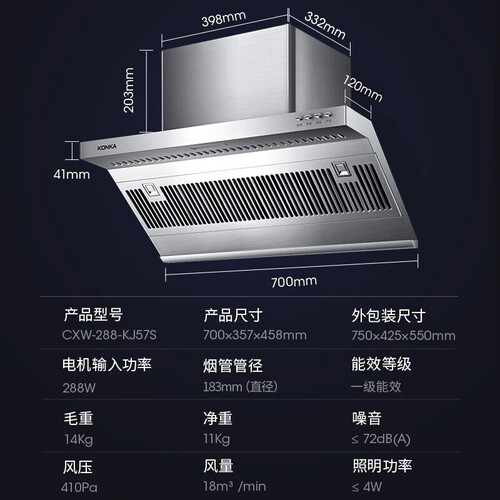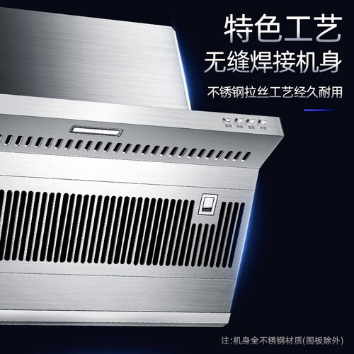 7字型顶侧双吸,排烟效果出众,轻松清空厨房油烟。700mm钢制机身,耐用防锈,时刻保持新颖。