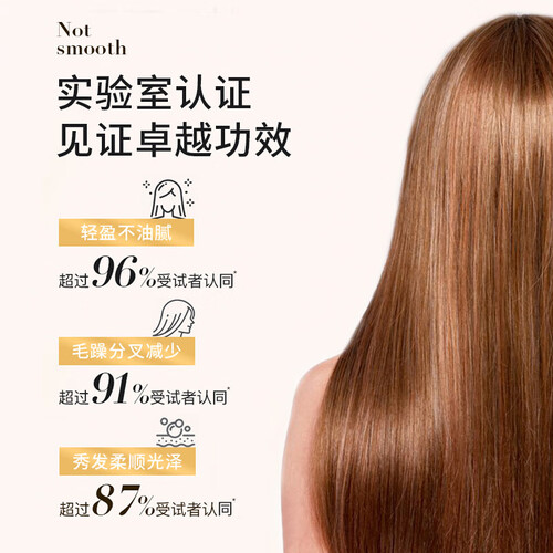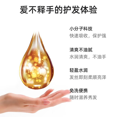 轻盈科技配方,5重功效赋予秀发全面营养,10秒顺滑,一滴缓解秀发干枯分叉、毛躁易断、烫染损伤,暗哑无光等问题。