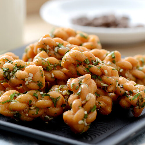 揉搓发酵而成的面团,充分接触食用油,每个小麻花体型都很饱满。表面附着的芝麻和干葱末,口感酥香,回味无穷。