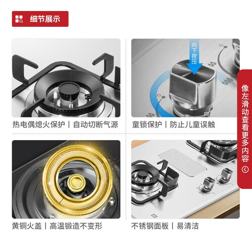 童锁保护,可有效防止孩子意外点火,安全时刻在线。五段火力阀体,轻松制作不同美味食材,轻松助你成为大厨。