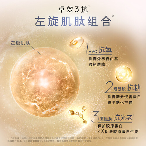 采用左旋肌肽和烟酰胺,抵御糖分,保护胶原蛋白不流失。三大保湿明星成分,提升肌肤保湿力,达到舒缓补水的效果。