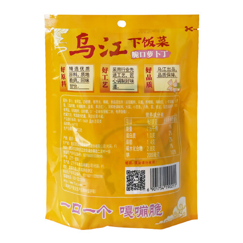 甄选乌江大萝卜,新鲜原料,利用自然风干萝卜,口感丰富。采用窖藏腌制,腌制半年以上的时间,即可享受脆爽萝卜。