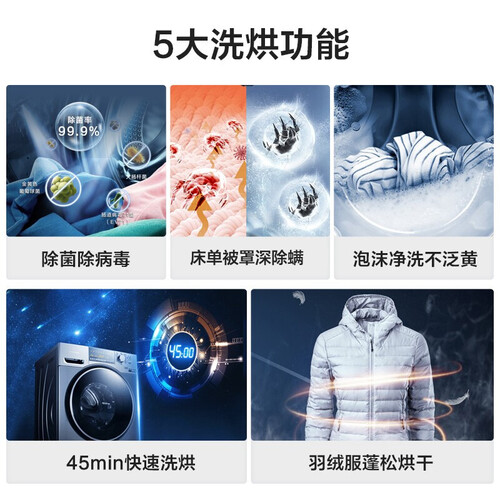 泡沫净技术通过泡沫发生器,让高频水流溶解泡沫,快速漂净衣物不残留。双极除螨,让你远离尘螨过敏原。45分钟快洗快烘,无需晾晒。