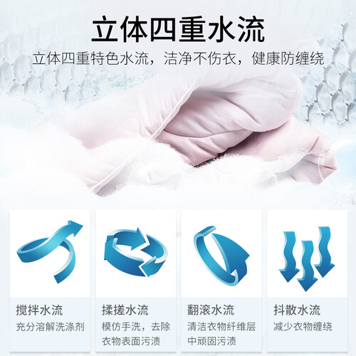 10公斤全自动大容量波轮洗衣机,可以满足全家人日常洗涤需求,不受任何约束。结合立体水流防缠绕技术,能够防止缠绕情况。