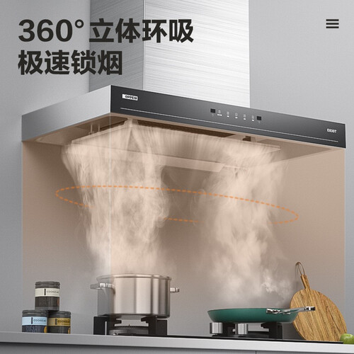 采用挥手智控设计,能够实现隔空挥手操作,避免油烟机面板污染。内置不锈钢一体成型拢烟腔,能够强力拢烟,让油烟无处可藏。