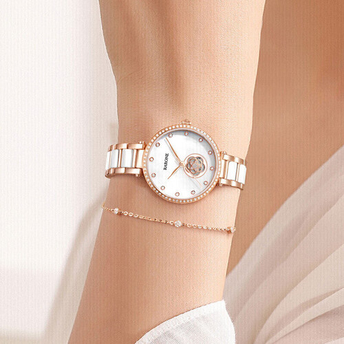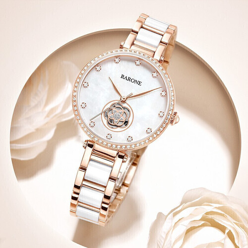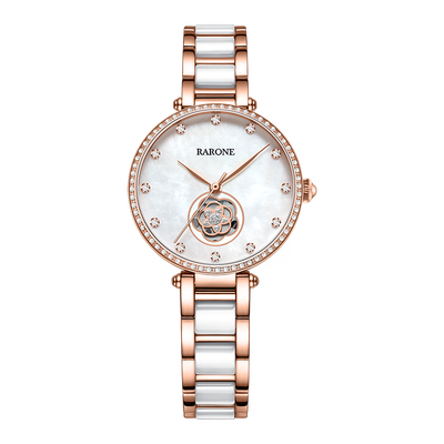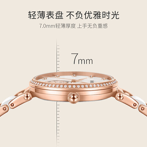 镂空山茶花的表盘设计,做工精细,造型栩栩如生,凸显浪漫的气息,搭配轻薄的表盘设计,贴合腕间佩戴无负重感。