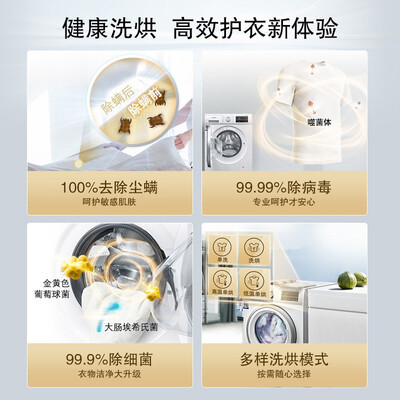 洗烘一体,可洗可烘省时省心,解放阳台更省空间。搭载热风除菌,100%去除尘螨,自然热风除螨方式,安全无残留。