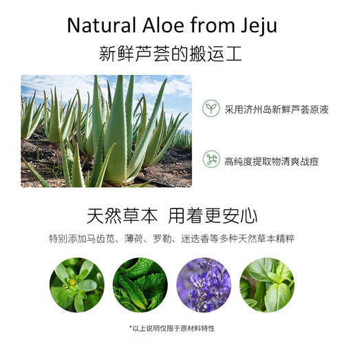 蕴含鲜活的芦荟汁,为肌肤注入充足的水动力,更显饱满盈润。辅以马齿苋、薄荷等提取物,轻松解决多种肌肤难题,安心呵护肌肤。