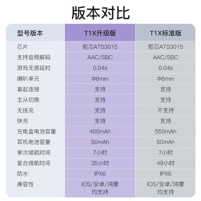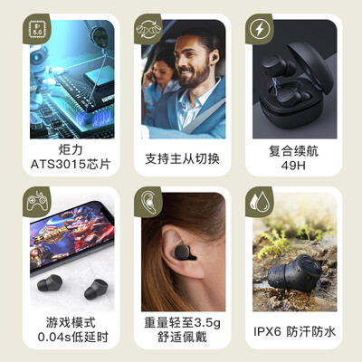 耳机体积小巧,重量轻盈,佩戴舒适稳固,不易掉落。拥有秒速连接功能,让你享受音乐无需多等。49小时音乐不止,畅快听歌。