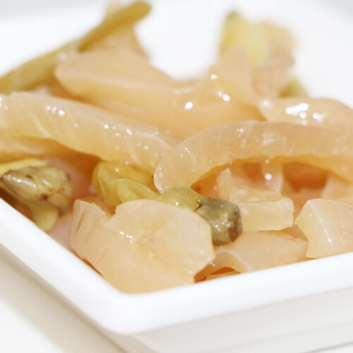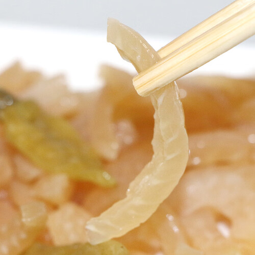 晶莹通透的猪皮晶,质地肥厚,富含满满的胶原蛋白,味道鲜美。以山椒入味,口感更加酸辣劲爽,让人吮指回味。