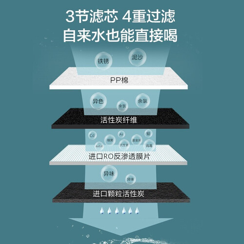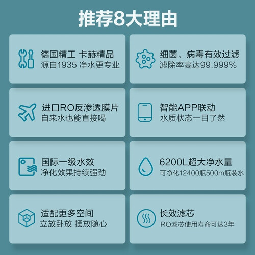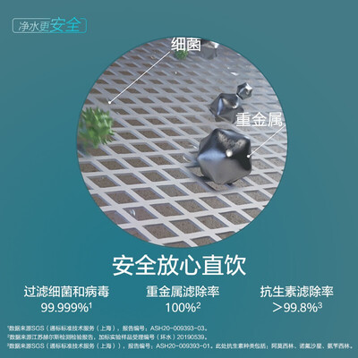 进口RO反渗透过滤,过滤性能出色,滤芯寿命长,无需频繁更换。有效过滤99.999%细菌和病毒,呵护家人饮水健康。