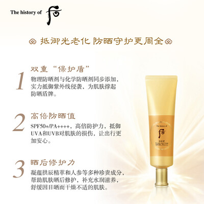 质地轻盈不粘腻,上脸清爽舒适,无厚重感,含有人参精华成分,抵御紫外线的伤害,还有效补充肌肤水分,舒缓肌肤干燥。