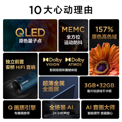QLED原色量子点,色域值高达157%,突破感官认知。杜比视界和杜比全景声双重加持,带来听觉和视觉上的双重享受。