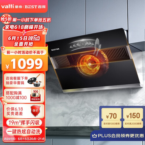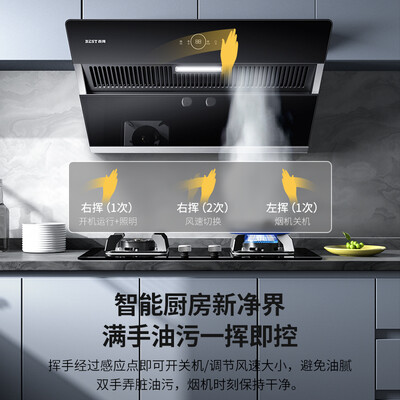 触屏挥手双控制,随心操控更快捷,老人使用无负担。拥有飓风大吸力,搭配巨幕导烟屏,吸走油烟更快速,油烟不上脸。