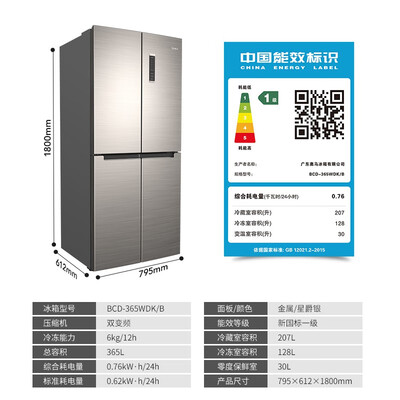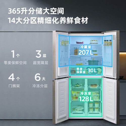 365升大容量,十字四门存储格局,食材各就其位,保鲜不串味。设有保湿膜果蔬盒,锁住果蔬水分,延长生命力。