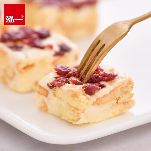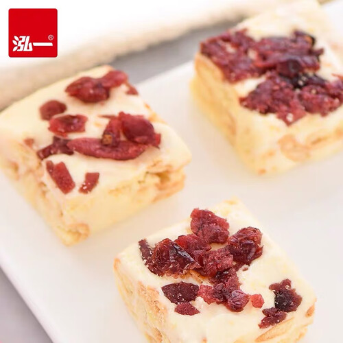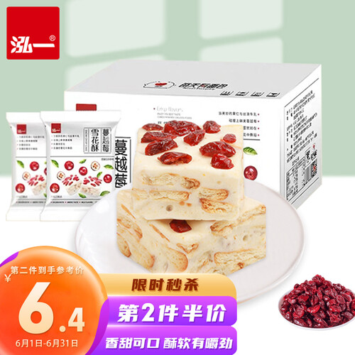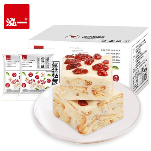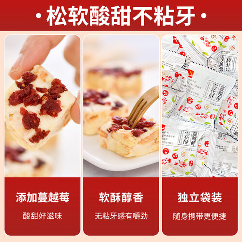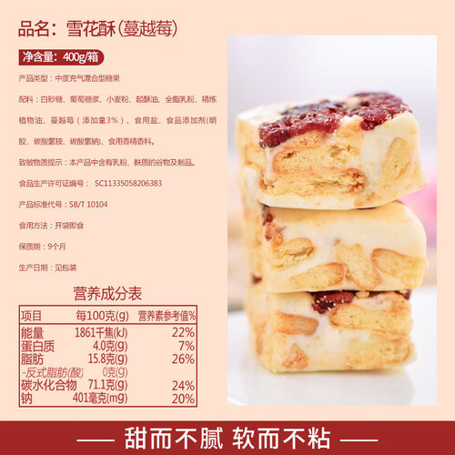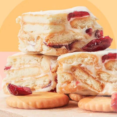将牛轧糖与饼干融合,采用饼干、蔓越莓干、奶油、麦芽糖为原料制作。口感软酥又不乏嚼劲,酸甜交织、层次分明。