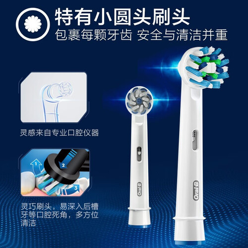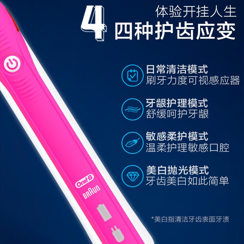 特有小圆头刷头,可以深入口腔死角,实现多方位的清洁。还拥有4种护齿模式,日常清洁、抛光去渍等可按需选择,为约会助力。