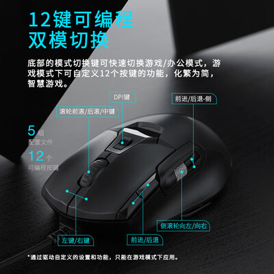 搭载游戏和办公两种模式可切换,在游戏模式中可自定义12个按键的功能,提升游戏的胜率。专属的驱动,享智慧游戏。
