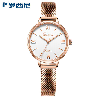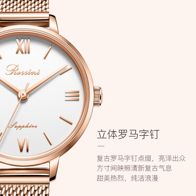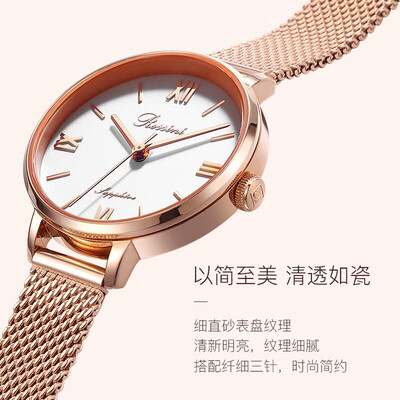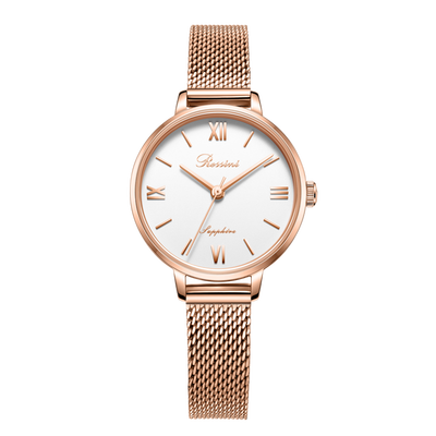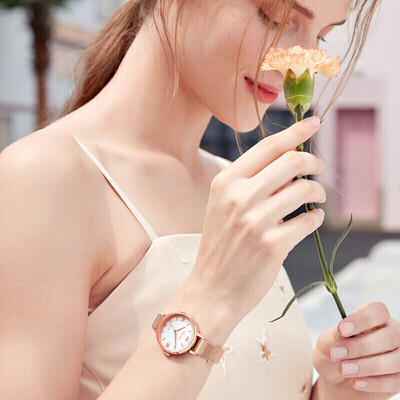 优雅简洁的白色细直砂表盘,在简约中诠释精致的时尚,玫瑰金配色显得十分优雅,编织金属腕带,舒适佩戴,简约时尚。