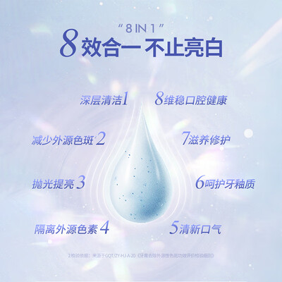 不含漂白剂,用起来更放心,八种功效集于一体,实力抵抗牙菌斑。膏体温和低摩擦,呵护您的口腔和牙龈,让牙龈更加健康。