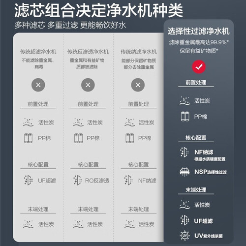 选择性过滤专利技术,在吸附有害物的同时,保留有益人体的矿物质,喝水喝健康。全水路自动冲洗,滤芯畅通无阻,不产生二次污染。