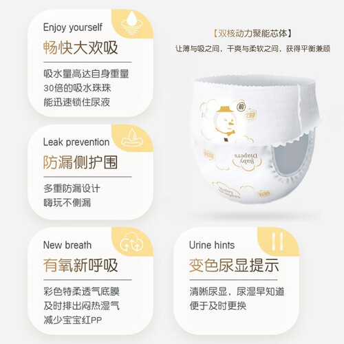 热风打点面层的设计,够减少宝宝出现红屁屁的情况,贴心呵护宝宝娇嫩肌肤。采用防漏测护围,宝宝尽情玩耍,妈妈不担心侧漏。