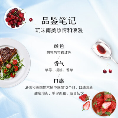 带有草莓、红樱桃和香草气息的干红葡萄酒,酒体丰厚圆润,单宁柔和细腻。适合于多种不同的食物搭配,带来不一样的口感体验。