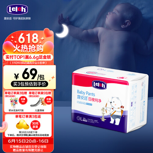 具有巨能吸的功能,可吸自身重量30倍的尿液,还可以保持持久干爽。采用了蝶翼三重防漏的系统,让宝宝在床上可以随意翻动。