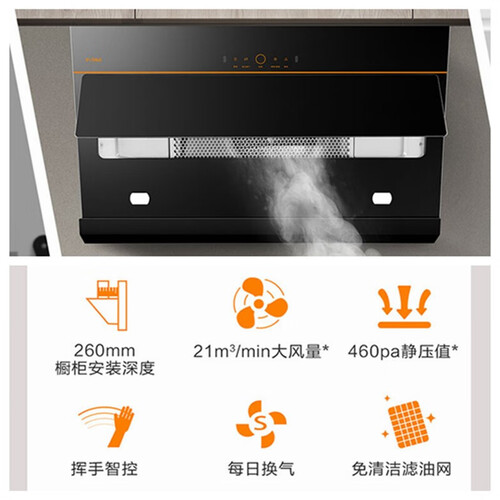 悬浮叠翼全黑机身设计,有效减少油烟的扩散,且容易清洁。搭载全新的手感智控技术,不需要触碰,用手一挥就能轻松操控。
