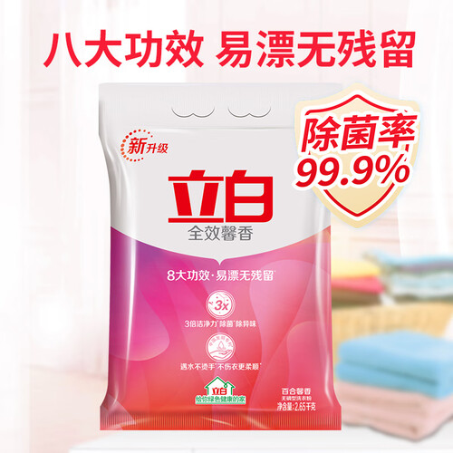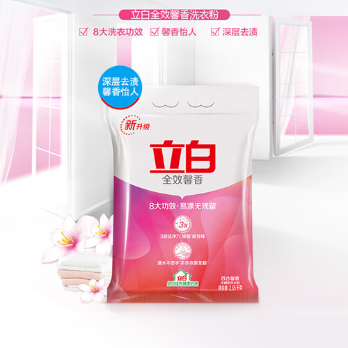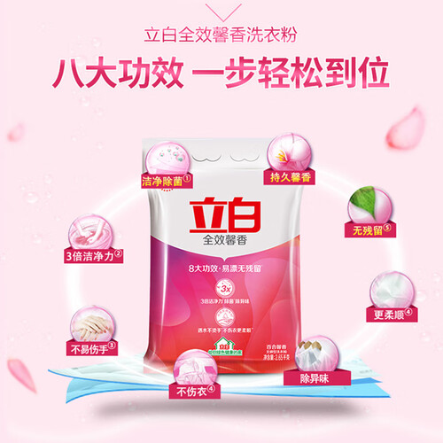 拥有三倍洁净力、除菌除异味、深层洁净、无碱性残留的馨香洗衣粉,遇水不烫,洗后留香持久,衣物蓬松柔软。