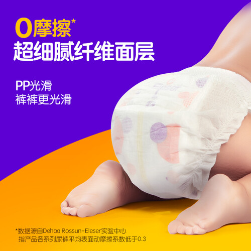 采用进口吸收高分子,能将尿液牢牢锁住,不易反渗更放心。搭载透薄底膜,帮助减少穿着不适感,宝宝更愿意穿。