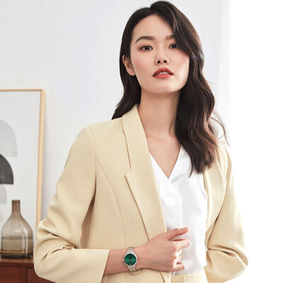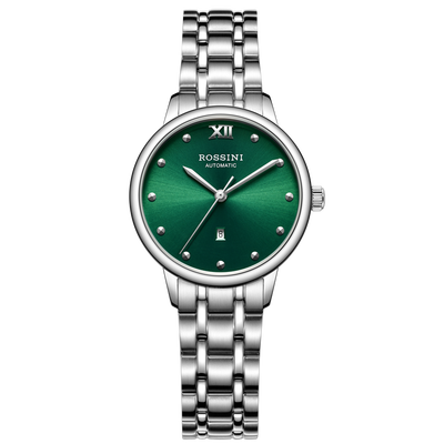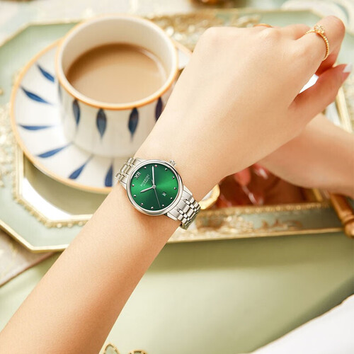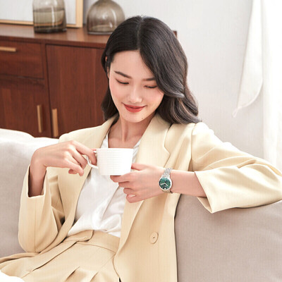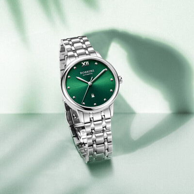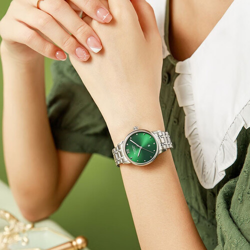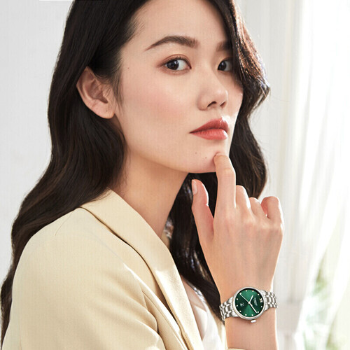 温润的宝石绿色表盘,简化的圆点刻度设计,立体的三大针保持镜面艺术感。进口机械机芯,走时误差小,带有50米防水效果。