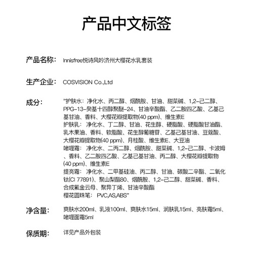 含有济州大樱花提取物,能够帮助肌肤储存所需的水分,提高肌肤含水量。不含酒精的制作配方,上脸不刺激,易敏肌肤也可放心使用。