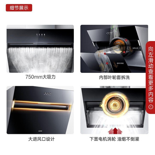 采用侧吸式设计,多方位急速聚拢油烟,防止油烟逃逸。拥有小巧身形,不占用多余空间,适合小户型家庭使用。
