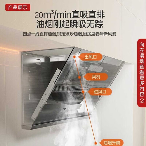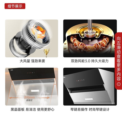 采用四点一线直排油烟,能有效避免油烟扑面的情形,带来更好的烹饪体验。烟机搭载双劲风轮3.0系统,澎湃的大吸力能稳定持久。