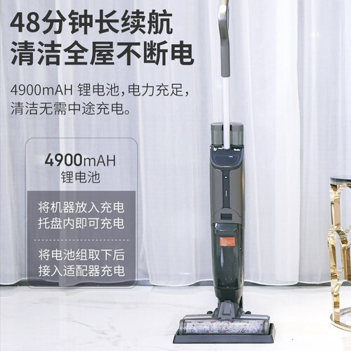 分离式设计,可单独更换电池,无需清洁中途充电,便捷省心。4900mAh锂电池,电量充沛,48分钟长续航,无惧大户型清洁。